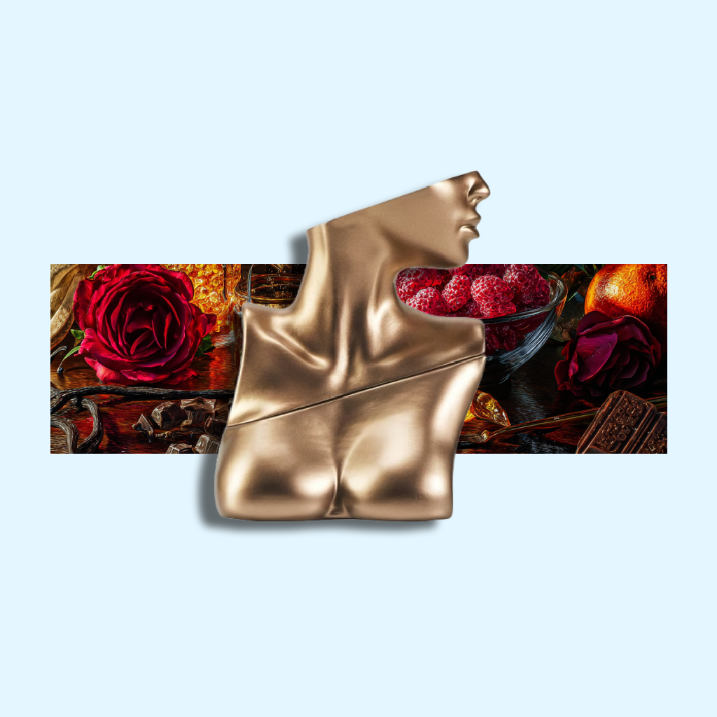Dès l’ouverture, les baies rouges et la mandarine apportent une touche fruitée et éclatante. Le cœur dévoile une vanille bourbon crémeuse, des épices douces et un cacao velouté. En fond, les muscs chauds, les bois lactés et la fève tonka prolongent l’expérience avec intensité et profondeur.